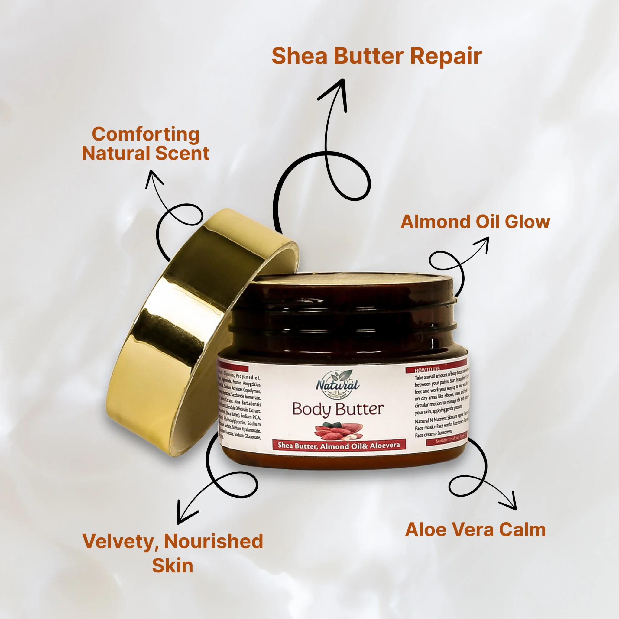 A luxurious, ultra-nourishing body butter designed to rescue dry, rough, and depleted skin. Powered by Shea Butter, Almond Oil, and Aloe Vera Leaf Extract, this rich, buttery formula melts into the skin—delivering deep hydration, restoring elasticity, and repairing damage from within.