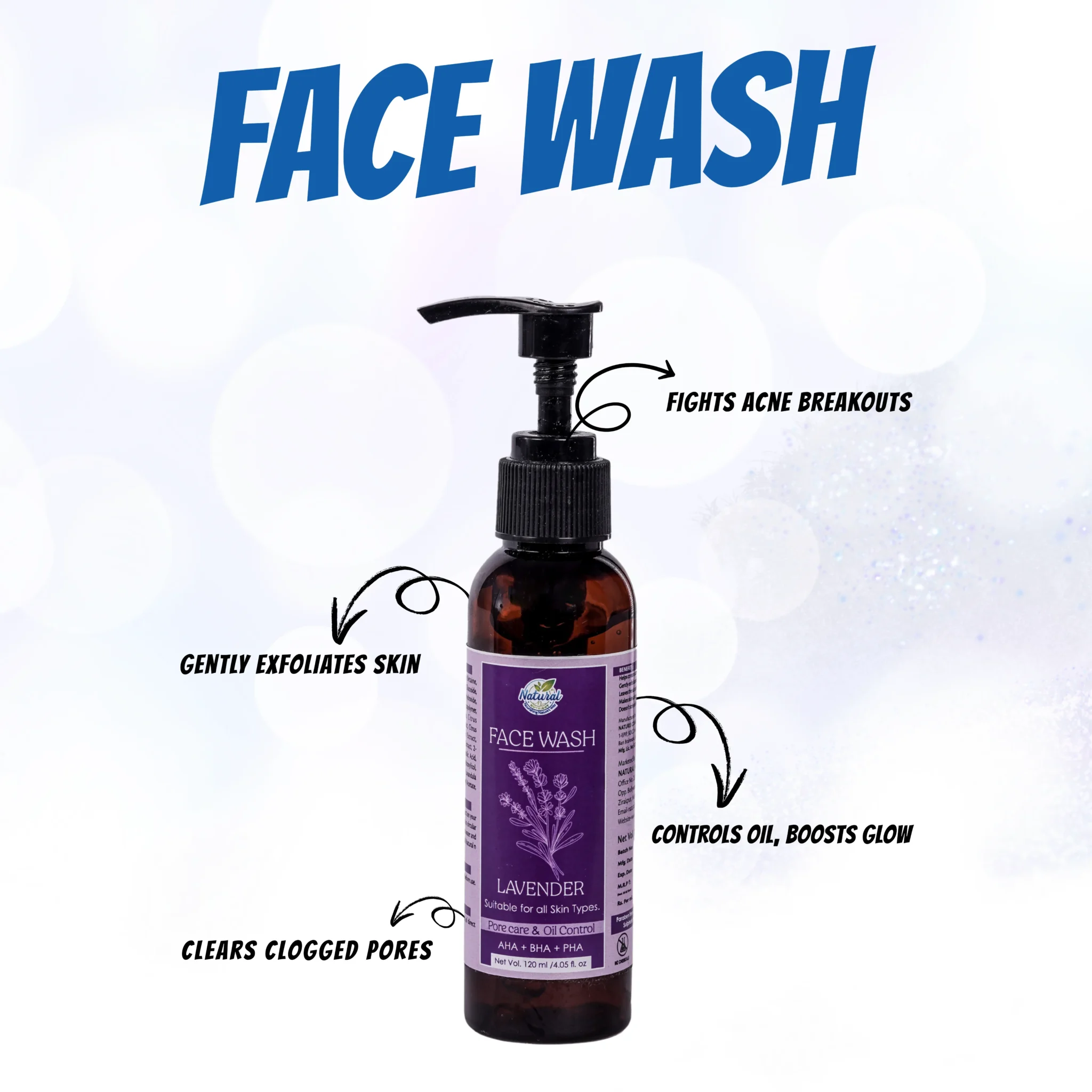 A soothing yet powerful cleanser enriched with Lavender Extract, AHA (Glycolic & Lactic Acid), BHA (Salicylic Acid), and PHA (Gluconolactone) to gently exfoliate, clear clogged pores, and combat acne—without drying out your skin.