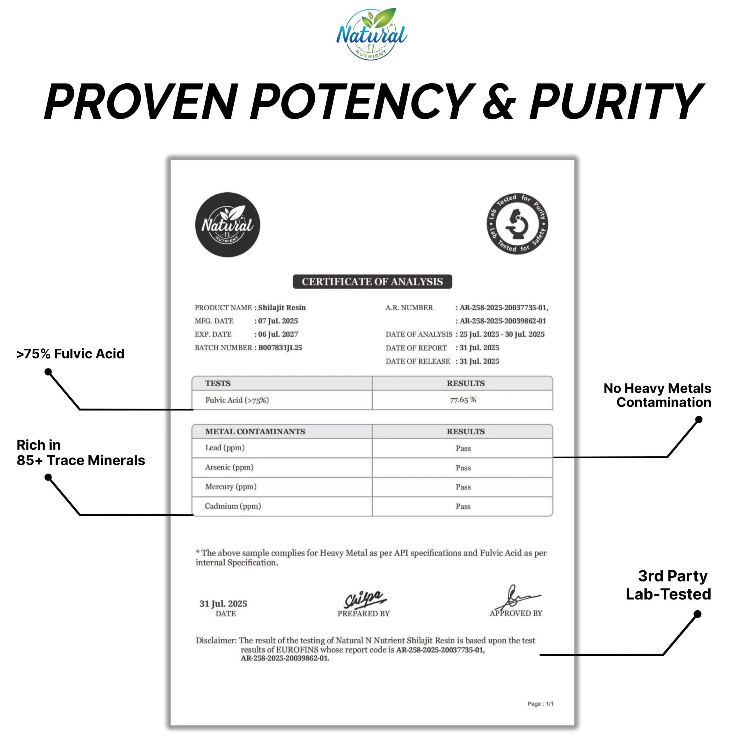 Natural N Nutrient Shilajit Resin is a classical Ayurvedic powerhouse, purified and prepared for maximum potency. Each serving delivers pure Shilajit resin packed with >75% fulvic acid and 85+ trace minerals, fueling stamina, strength, vitality, and internal balance.Celebrated for centuries as a premier Rasayana (rejuvenator), Shilajit is renowned for boosting physical power, endurance, and muscle recovery while helping to reduce stress and sharpen mental focus. A true must-have for fitness and gym enthusiasts, it also supports immunity, energy, and healthy ageing—making it a complete daily vitality booster.
